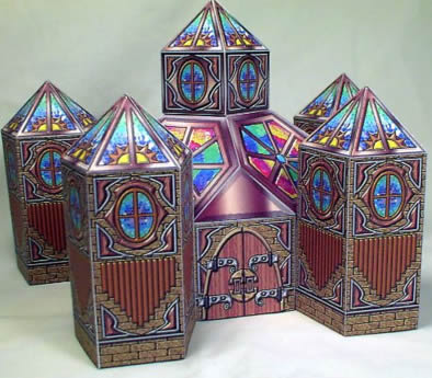 Talking of cheaper options, you can find yourself some very fine quality card buildings for sale. Microtactix Games have an extensive range of card buildings, from earthworks (and seige engines!) to dungeons in their 'Dirt-Cheep Terrain' section and the brilliant 'Village-on-the-Cheep' sets. The village sets have been re-vamped to add colour and modularity and at 6U$D a set (4-6 full buildings plus additionals per set) they must be the best way to cheaply and rapidly build an environment for your minis to explore or battle over. Regular town buildings (esp taverns!) muck in with city walls, towers, a splendid 'elf temple' and of course a ruined castle.