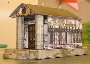 Another $10 well-spent is the dungeon card sets from Stone-Edges, two available sets with quite a different feel. Both are the same (1.5") scale* as Microtactix's "heroic" sets, but the more sophisticated patterns, (especially the slime-covered walls of volume 1) and curved wall sections give these stones the edge for me. * For 1" scale reduce by a third on your 'puter before printing, duh! |